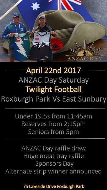 On Saturday April 22, as part of the ANZAC round, Roxburgh Park will host East Sunbury at Lakeside Reserve in a special twilight match. It will be a truly memorable occasion so make sure you get down to the ground for our ANZAC day extravaganza. As well as the traditional playing of the last post and a special guest to sing the national anthem before the game, we will also be drawing the ANZAC day raffle, hosting our sponsors day and announcing the winner of our alternate jumper competition. Make sure you add the date to your calendar – APRIL 22 starting with under 19.5s at 11:45am, reserves at 2:15pm and the seniors kicking off around 5pm.